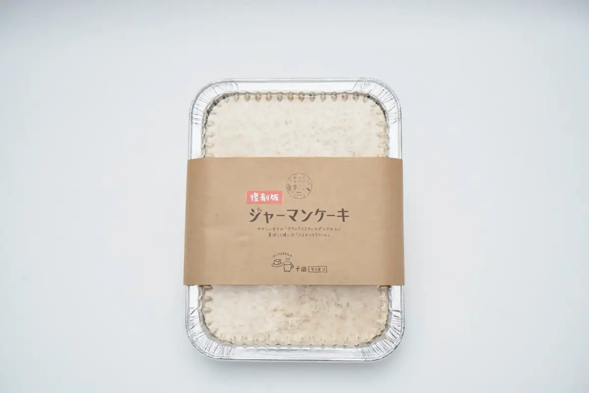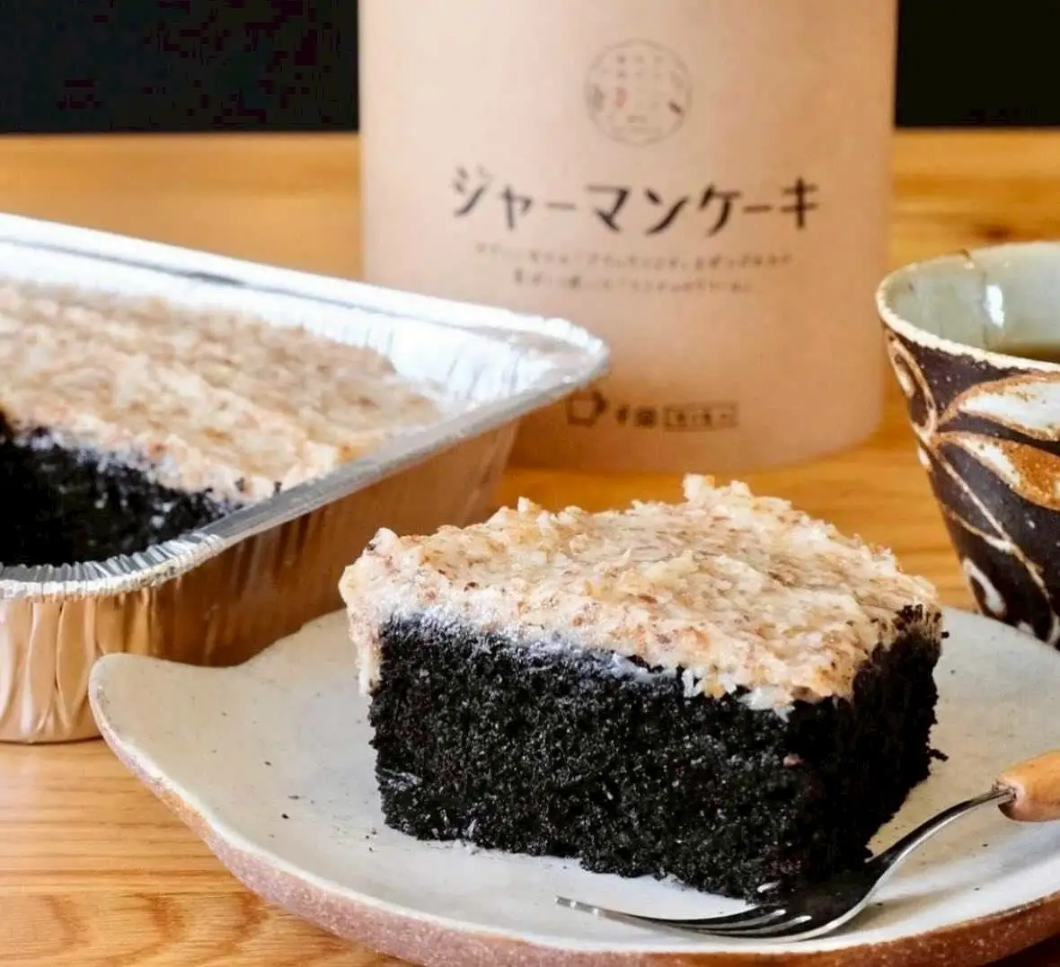 ブラックココアのスポンジ生地にココナッツペーストをのせた、SATOMIYAオリジナルレシピで作られたジャーマンケーキは、冷凍販売のため解凍時間によってスポンジのふわふわ食感やアイスケーキのような食感を楽しむことができます。